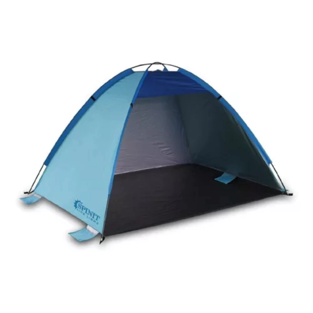 Carpa abierta ideal para la playa, para reposar a la sombra y disfrutar del día. Fabricada con varillas de fibra de vidrio, piso de rafia y cubretecho en poliéster, aluminizada. Confeccionada con tela silver. Con bolsillos exteriores para la arena y funda de transporte.